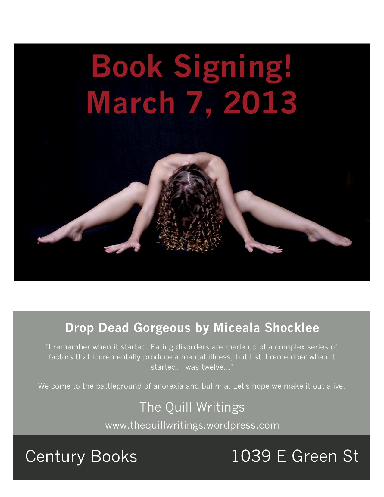 The best part of Drop Dead Gorgeous by author Miceala Shocklee is her passion to write her own story about her eating disorder.  She writes about how eating disorders hold a deadly attraction. There is the attraction of winning, of reaching “ultimate thinness” but there is also the attraction of playing. There is a seductive temptation in the eating disorder game.