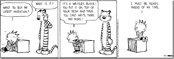 It’s not a complete-and-total case of writer’s block; I have been writing every day for a while on a site called 750words.com (more on that later) and that’s been incredibly helpful, but the writing has been largely personal, I kind of blog-style journal full of ranting and writing myself in circles and generally typing myself into an “oh god oh god oh god” kind of frenzy.